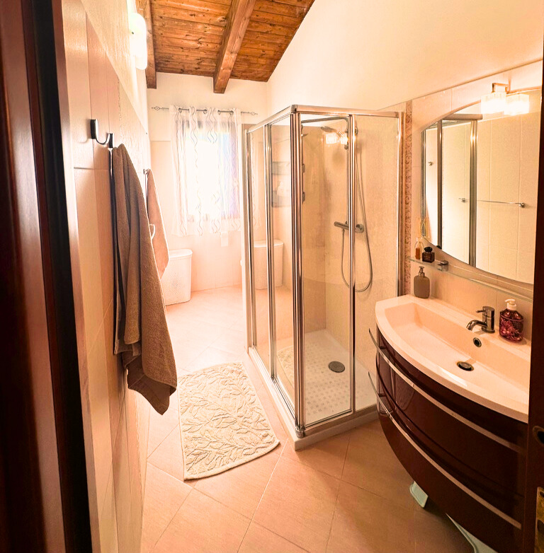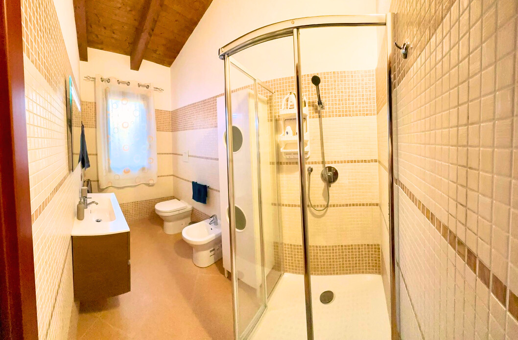 Prostorná a prosvětlená koupelna přístupná z chodby u obývacího pokoje. Je vybavena sprchovým koutem, WC, bidetem, umyvadlovou skříní se zrcadlem a fénem na vlasy.