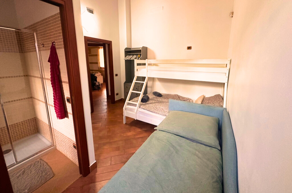 Pokoj je ideální pro děti nebo další hosty. Nabízí patrovou postel s dolním lůžkem š. 140cm a horní palandou. Dalším lůžkem je samostatná postel. V pokoji jsou také úložné prostory a klimatizace.