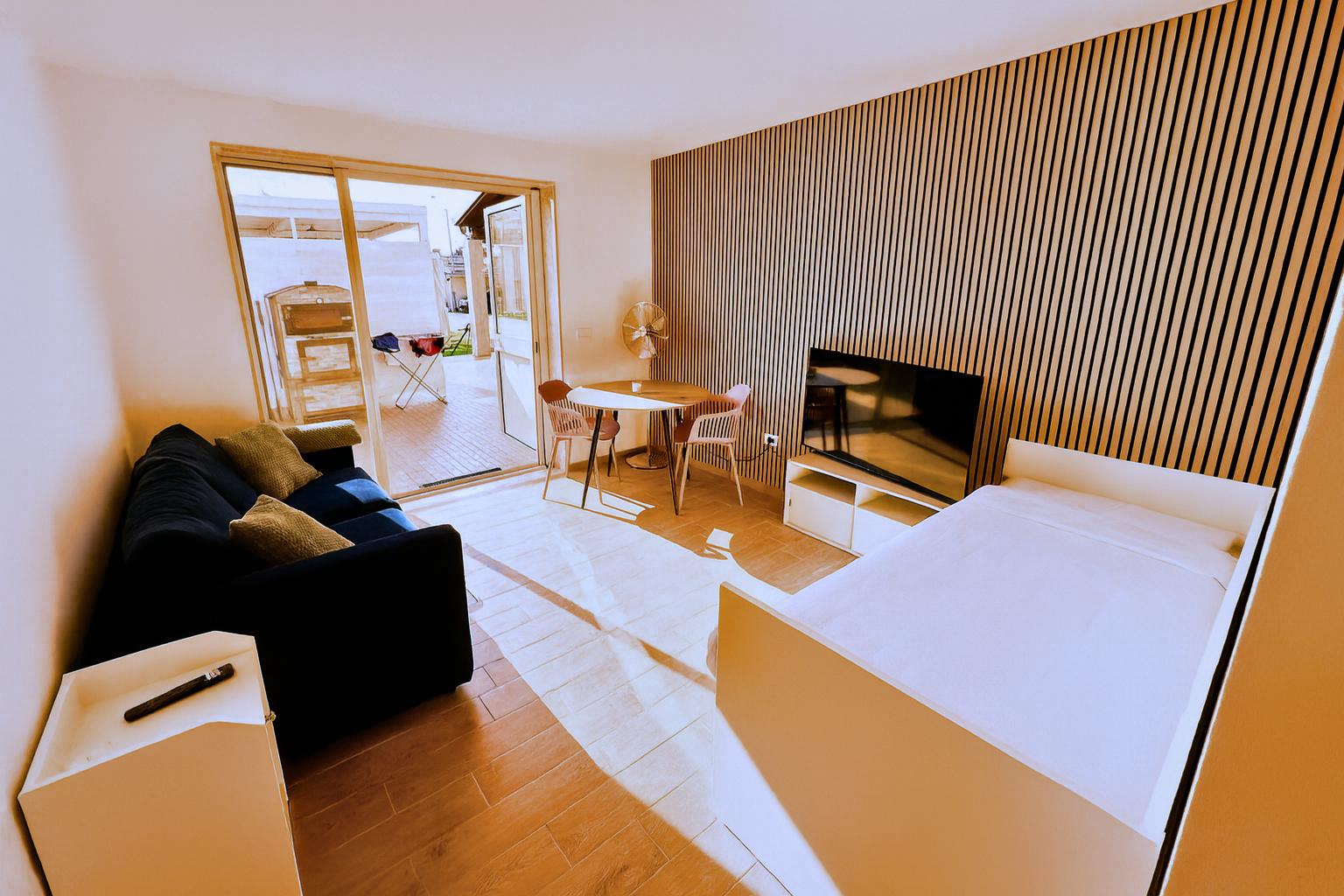Naleznete zde venkovní jídelní stůl pod krytou terasou, komfortní lounge pergolu a bazén vhodný pro osvěžení během horkých dní. (bazén je k dispozici v termínech od 4-10 měsíce roku)